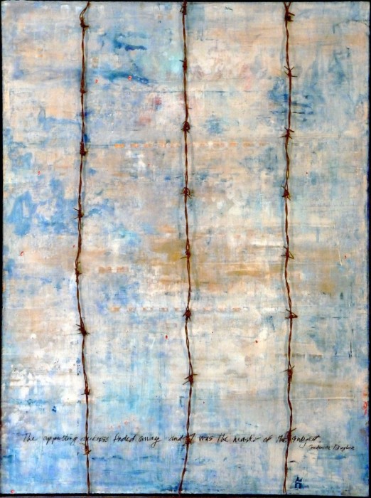 30" x 40" x 1" Mixed media and barbed wire on plexiglass panel, birch support, steel frame. availabletags: #Slavery#justice#Equality#FrederickDouglass#Americanhistory#knowledge is freedom#endoppression #endracism #endwhitesupremacy #allthesamerace #weallbleedthesameblood